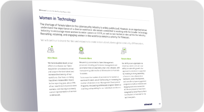 Mimecast Australia Gender Pay Gap Report 2023 Women in Technology The shortage of female talent in the cybersecurity industry is widely publicized. However, as an organization we understand the importance of a diverse workforce. We remain committed to working with the broader technology industry to encourage more women to enter careers in STEM, as well as non-technical roles within the industry. Recruiting, retaining, and engaging women in the workforce remains a priority for Mimecast. We will continue to invest the time and resources to create a more vibrant, diverse global community of Mimecasters. Hire More Promote More Retain More We have doubled down on our We are fully committed to Talent Management Our ability as an organization to e昀昀orts to enhance our Talent processes including performance management and retain top talent is critical to our Acquisition processes to attract promotion that are equitable, clear, and unbiased, with ability to scale with growth. Our and acquire the best talent and transparent guidelines for all Mimecasters in Australia approach to retention is supported increase the diversity of our to access. by investing in strong leadership, workforce. Our focus on hiring a focus on cross collaboration To increase the number of promotions for women as has driven measurable impact. we move forward, we will be focusing on increasing the teamwork, career development, In the reporting year, about 31% number of women on our Management Development and overall employee engagement of our new hires in Australia were Programs, the Leading at Mimecast program, BetterUp programs to build an inclusive and women, contributing to a steady coaching and up-skilling for our individual contributors. engaging work environment for overall representation of women all. We are pleased to have been in Mimecast. recognized by Great Place to Work Certi昀椀cations in Australia for the last three years. 03