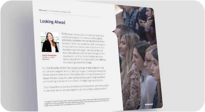 Mimecast Australia Gender Pay Gap Report 2023 Looking Ahead “At Mimecast, we are proud to have a strong focus on Diversity, Equity and Inclusion and our global philosophy permeates through all elements of our business. Whilst we are pleased with the progress to date, we know there is more to be done in this incredibly important space. We will continue to drive education around this topic throughout the Carly Stoneman organisation, with our Senior Leadership Team HR Director APAC, Mimecast being charged with the responsibility to challenge the status quo and drive change. Our local Diversity Action Plan includes a range of deliverables to help us promote change in terms of closing the gap – including increasing our female representation across the organisation, increasing awareness of issues that are unique to under-represented groups through our ERG’s and fostering a culture of true inclusion through ongoing education. I look forward to our journey of continuous improvement and I am excited to see what we can achieve together over the coming twelve months. “ To align with Australian government reporting requirements, data in this report refers to the traditional sex categories of male and female. Mimecast respects that gender is on a non-binary spectrum and reporting in this manner should not be interpreted as our position on this. 12