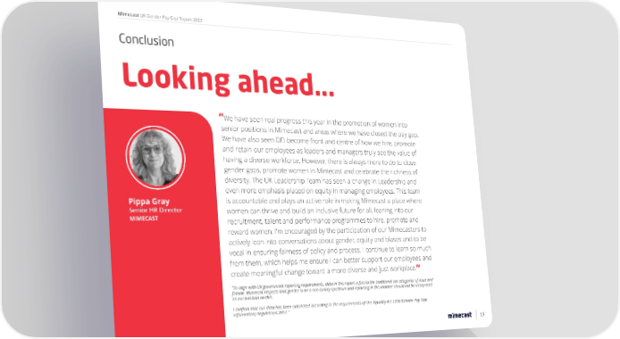 Mimecast UK Gender Pay Gap Report 2023 Conclusion Looking ahead... “We have seen real progress this year in the promotion of women into senior positions in Mimecast and areas where we have closed the pay gap. We have also seen DEI become front and centre of how we hire, promote and retain our employees as leaders and managers truly see the value of having a diverse workforce. However, there is always more to do to close gender gaps, promote women in Mimecast and celebrate the richness of diversity. The UK Leadership Team has seen a change in Leadership and even more emphasis placed on equity in managing employees. This team Pippa Gray is accountable and plays an active role in making Mimecast a place where Senior HR Director women can thrive and build an inclusive future for all, leaning into our MIMECAST recruitment, talent and performance programmes to hire, promote and reward women. I’m encouraged by the participation of our Mimecasters to actively lean into conversations about gender, equity and biases and to be vocal in ensuring fairness of policy and process. I continue to learn so much from them, which helps me ensure I can better support our employees and create meaningful change toward a more diverse and just workplace. “ "To align with UK government reporting requirements, data in this report refers to the traditional sex categories of male and female. Mimecast respects that gender is on a non-binary spectrum and reporting in this manner should not be interpreted as our position on this. I con昀椀rm that our data has been calculated according to the requirements of The Equality Act 2010 (Gender Pay Gap Information) Regulations 2017.” 13