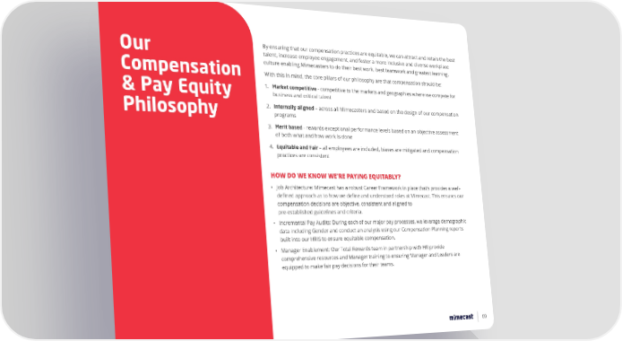 By ensuring that our compensation practices are equitable, we can attract and retain the best Our talent, increase employee engagement, and foster a more inclusive and diverse workplace culture enabling Mimecasters to do their best work, best teamwork and greatest learning. Compensation With this in mind, the core pillars of our philosophy are that compensation should be: 1. Market competitive - competitive to the markets and geographies where we compete for & Pay Equity business and critical talent Philosophy 2. Internally aligned – across all Mimecasters and based on the design of our compensation programs 3. Merit based - rewards exceptional performance levels based on an objective assessment of both what and how work is done 4. Equitable and Fair – all employees are included, biases are mitigated and compensation practices are consistent HOW DO WE KNOW WE’RE PAYING EQUITABLY? • Job Architecture: Mimecast has a robust Career Framework in place that’s provides a well- de昀椀ned approach as to how we de昀椀ne and understand roles at Mimecast. This ensures our compensation decisions are objective, consistent and aligned to pre-established guidelines and criteria. • Incremental Pay Audits: During each of our major pay processes, we leverage demographic data including Gender and conduct an analysis using our Compensation Planning reports built into our HRIS to ensure equitable compensation. • Manager Enablement: Our Total Rewards team in partnership with HR provide comprehensive resources and Manager training to ensuring Manager and Leaders are equipped to make fair pay decisions for their teams. 09