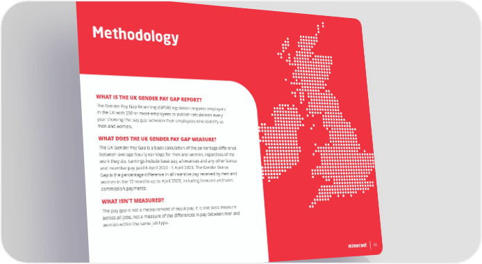Methodology WHAT IS THE UK GENDER PAY GAP REPORT? The Gender Pay Gap Reporting (GPGR) legislation requires employers in the UK with 250 or more employees to publish calculations every year showing the pay gap between their employees who identify as men and women. WHAT DOES THE UK GENDER PAY GAP MEASURE? The UK Gender Pay Gap is a basic calculation of the percentage di昀昀erence between average hourly earnings for men and women, regardless of the work they do. Earnings include base pay, allowances and any other bonus and incentive pay paid 6 April 2022 - 5 April 2023. The Gender Bonus Gap is the percentage di昀昀erence in all incentive pay received by men and women in the 12 months up to April 2023, including bonuses and sales commission payments. WHAT ISN’T MEASURED? The pay gap is not a measurement of equal pay. It is one basic measure across all jobs, not a measure of the di昀昀erences in pay between men and women within the same job type. 05