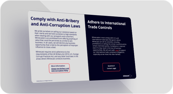 Comply with Anti-Bribery Adhere to International and Anti-Corruption Laws Trade Controls We pride ourselves on selling our solutions based on their merits and we hold ourselves to high standards when dealing with our prospects and customers. Mimecasters must comply with U.S. and Mimecasters are prohibited from offering anything of international trade laws that govern where value that could be perceived as a bribe to win Mimecast can sell its solutions, including business. In all cases, we will decline any business prohibitions on selling into certain countries and to opportunity that is tied to the perception of improper certain restricted parties. Compliance is required influence to close a deal. even if it may result in the loss of business opportunities. We will work with Legal to support Mimecast requires strict adherence to the our international trade compliance obligations, requirements of the UK Bribery Act 2010, U.S. Foreign especially as we move into new markets. Corrupt Practices Act, and any other local laws in the areas where Mimecast conducts business. More Information: Questions? Global Anti-Bribery and Contact: Legal Anti-Corruption Policy ©©22002244 MMiimemecacasst.t. AlAlll RRiigghhtsts RReesseerrvveedd.. 2626 ©2024 Mimecast. All Rights Reserved.