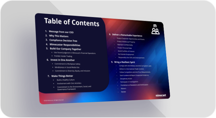 Table of Contents 1. Message from our CEO 8. Deliver a Remarkable Experience 2. Why This Matters • Protect Corporate Opportunities and Assets 3. Compliance Decision Tree • Protect Intellectual Property 4. Mimecaster Responsibilities • Maintain Confidentiality • Protect Personal Data 5. Build Our Company Together • Avoid Conflicts of Interest ▪ Use Sound Judgment in Mimecast9s Financial Operations • No Outside Employment ▪ Prohibit Insider Trading • Responsibly Use Gifts and Entertainment 6. Invest in One Another 9. Bring a Resilient Spirit ▪ Commitment to Workplace Safety • Comply with Anti-Bribery and Anti-Corruption Laws ▪ Mindfulness in Social Media Use • Adhere to International Trade Controls ▪ Commitment to Diversity, Equity, and Inclusion • Follow Competition and Anti-Trust Requirements 7. Make Things Better • Seek Guidance & Report Suspected Violations ▪ Build a Healthy Culture • Disciplinary Action ▪ Involvement with Civic Activities • Participate in Investigations ▪ Commitment to the Environment, Social, and • Prohibition on Retaliation and Victimization Governance Framework • Waivers • Review ©2024 Mimecast. All Rights Reserved.
