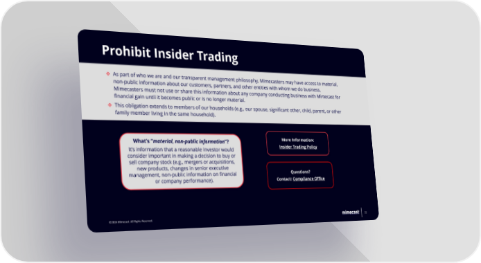 Prohibit Insider Trading ❖ As part of who we are and our transparent management philosophy, Mimecasters may have access to material, non-public information about our customers, partners, and other entities with whom we do business. Mimecasters must not use or share this information about any company conducting business with Mimecast for financial gain until it becomes public or is no longer material. ❖ This obligation extends to members of our households (e.g., our spouse, significant other, child, parent, or other family member living in the same household). What’s