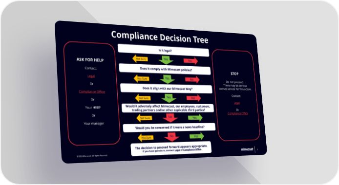 Compliance Decision Tree Is it legal? Not Sure Yes No ASK FOR HELP Contact: Does it comply with Mimecast policies? STOP Legal Not Sure Yes No Do not proceed. Or There may be serious Does it align with our Mimecast Way? consequences for this action. Compliance Office Contact: Or Not Sure Yes No Legal Your HRBP Would it adversely affect Mimecast, our employees, customers, trading partners and/or other applicable third parties? Or Or Compliance Office Not Sure No Yes Your manager Would you be concerned if it were a news headline? Not Sure No Yes The decision to proceed forward appears appropriate. If you have questions, contact: Legal or Compliance Office. ©©22002244 MMiimemecacasst.t. AlAlll RRiigghhtsts RReesseerrvveedd.. 66