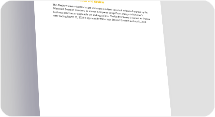 Modern Slavery Act Disclosure Statement Approval, Communication and Review Effective March 2023 This Modern Slavery Act Disclosure Statement is subject to annual review and approval by the Mimecast Board of Directors, or sooner in response to significant changes in Mimecast’s business practices or applicable law and regulations. The Modern Slavery Statement for financial year ending March 31, 2024 is approved by Mimecast’s Board of Directors as of April 1, 2024. 4 © 2022 MIMECAST | ALL RIGHTS RESERVED