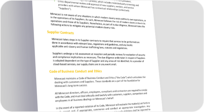 Modern Slavery Act Disclosure Statement ▪ Consideration of high-risk countries where modern slavery is more prevalent; ▪ A third party risk management process, which includes restricted party screening; and Effective March 2023 ▪ Cross-departmental review and approval of new suppliers, vendors, and service providers with whom Mimecast has contractual relationships (collectively